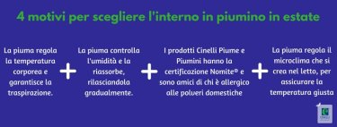 Se in primavera siamo soliti mettere da parte il piumino e dormire soltanto con il lenzuolo, alla ricerca di un po’ di fresco, Cinelli Piume e Piumini ha 4 motivi per scegliere il giusto interno piumino anche in estate, per sfatare l’idea che la piuma sia solamente fonte di calore.