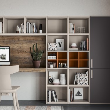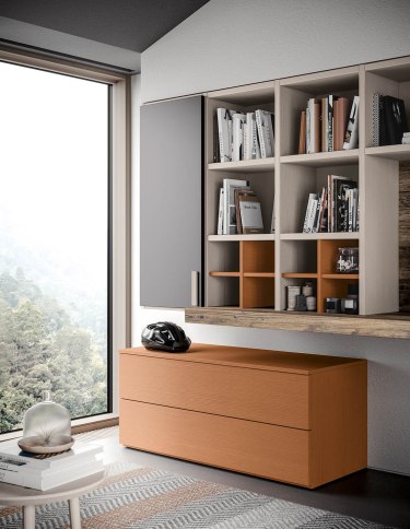 Tutta la composizione è contraddistinta da un gioco di contrasti armonici e dinamici. Le tonalità calde del caffè, utilizzate per le ante, e quelle chiare del quinoa spazzolato della struttura sono pensate per accordarsi all’originalità del tono deciso e contemporaneo del colore aragosta scelto per alcuni vani a giorno e la cassettiera.